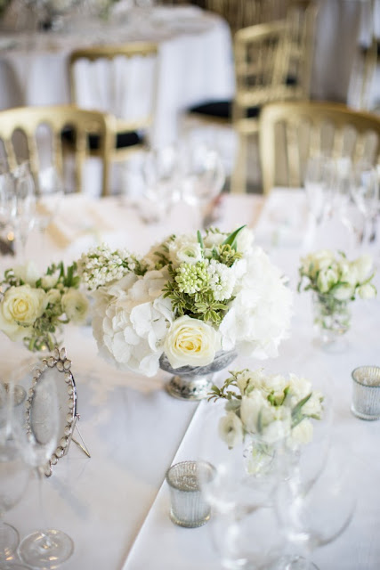 The tables looked so fresh with the white and green floral arrangements and silver and pearl accessories...